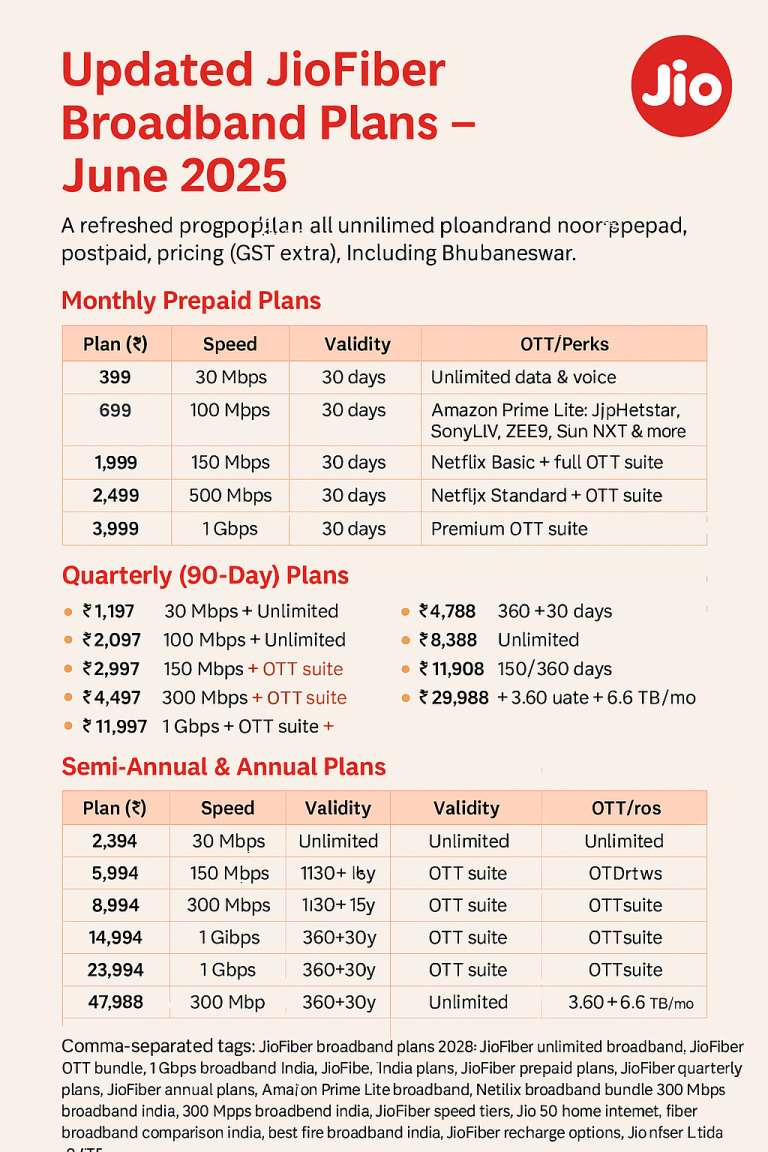 Jio Fiber Guwahati 2025 JioFiber’s most popular unlimited broadband plans (prepaid and postpaid) now available across India, including Bhubaneswar, focusing...