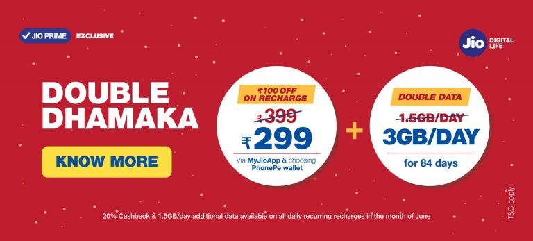 Reliance Jio Additional 1.5GB Per Day Under Double Dhamaka